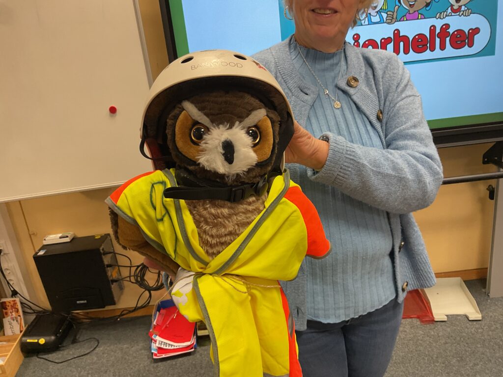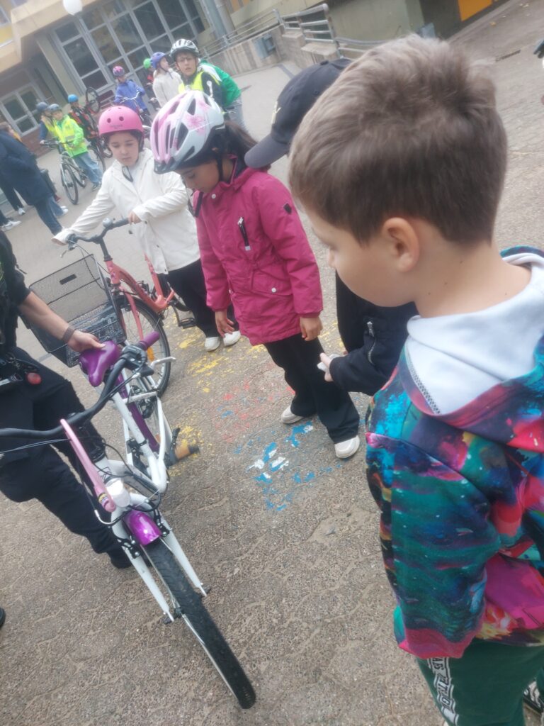 Die ersten Klassen übten das richtige Verhalten auf dem Gehweg, das sichere Überqueren der Straßen und lernten Verkehrsschilder kennen, die für sie im Alltag besonders relevant sind. Mit Unterstützung unserer Lehrkräfte und Mitarbeiterinnen der Schule wurde das „Links-Rechts-Links“-Schauen zur Routine – und das mit viel Spaß! Außerdem absolvierten sie ebenso wie die Zweitklässler mit Rollern auf dem Schulhof einen Verkehrsparcour.