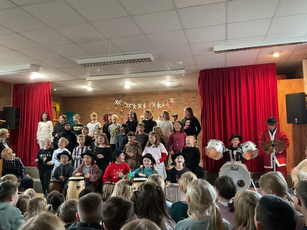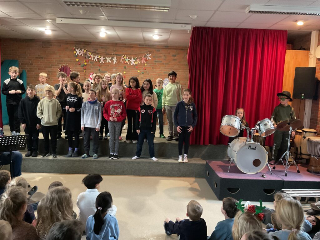 Die Klasse 4b brachte mit „Rudolph the Red-Nosed Reindeer“ weiteren weihnachtlichen Schwung in die Aula und zeigte, wie viel Freude gemeinsames Musizieren bereitet.